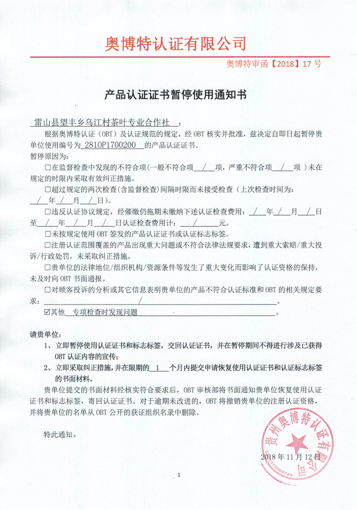 暫停雷山縣望豐鄉(xiāng)烏江村茶葉專業(yè)合作社產(chǎn)品認證證書使用通知書