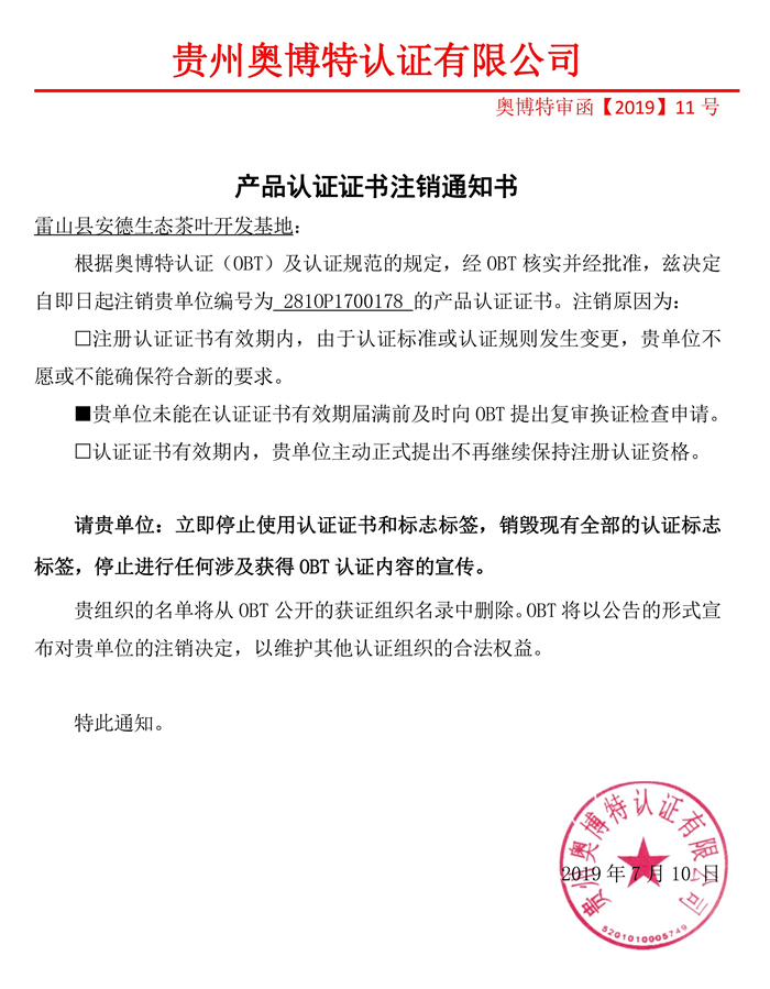 注銷雷山縣安德生態(tài)茶葉開發(fā)基地產(chǎn)品認(rèn)證證書