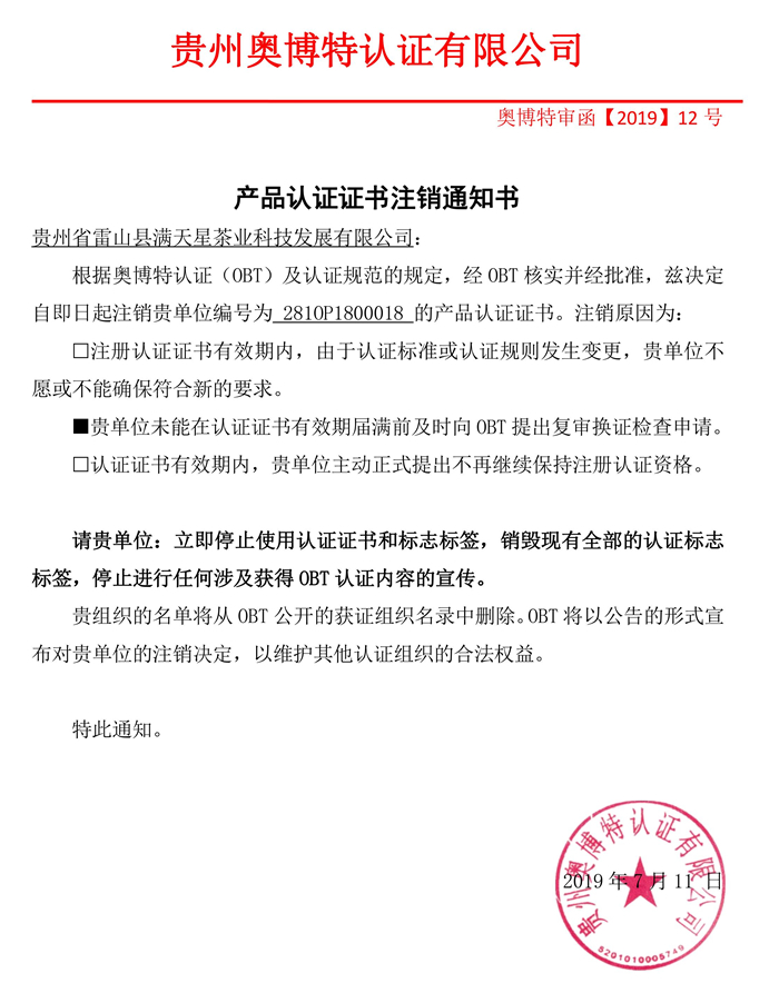 注銷貴州省雷山縣滿天星茶業(yè)科技發(fā)展有限公司產(chǎn)品認證證書