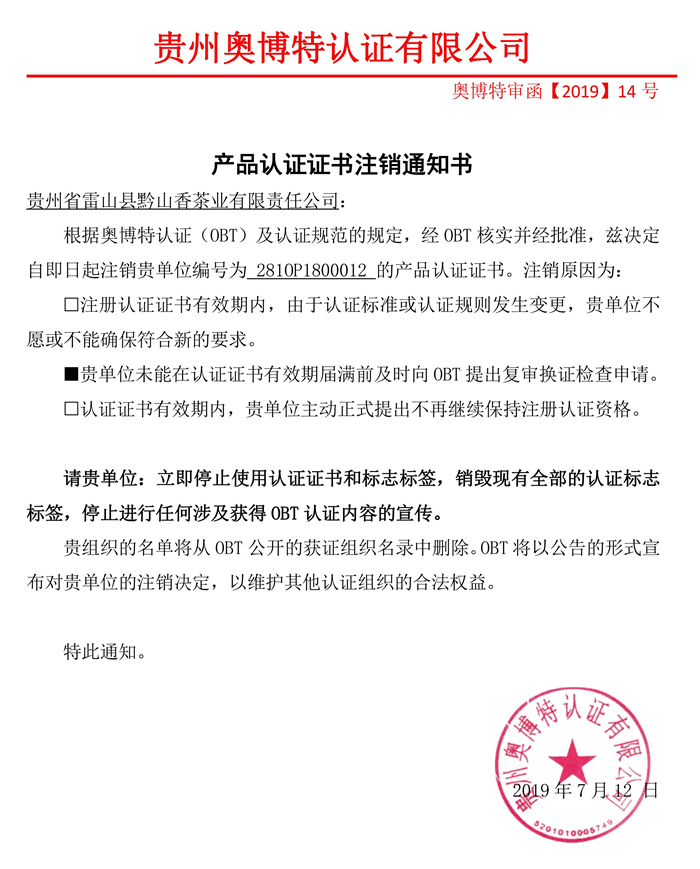 注銷貴州省雷山縣黔山香茶業(yè)有限責(zé)任公司產(chǎn)品認(rèn)證證書通知