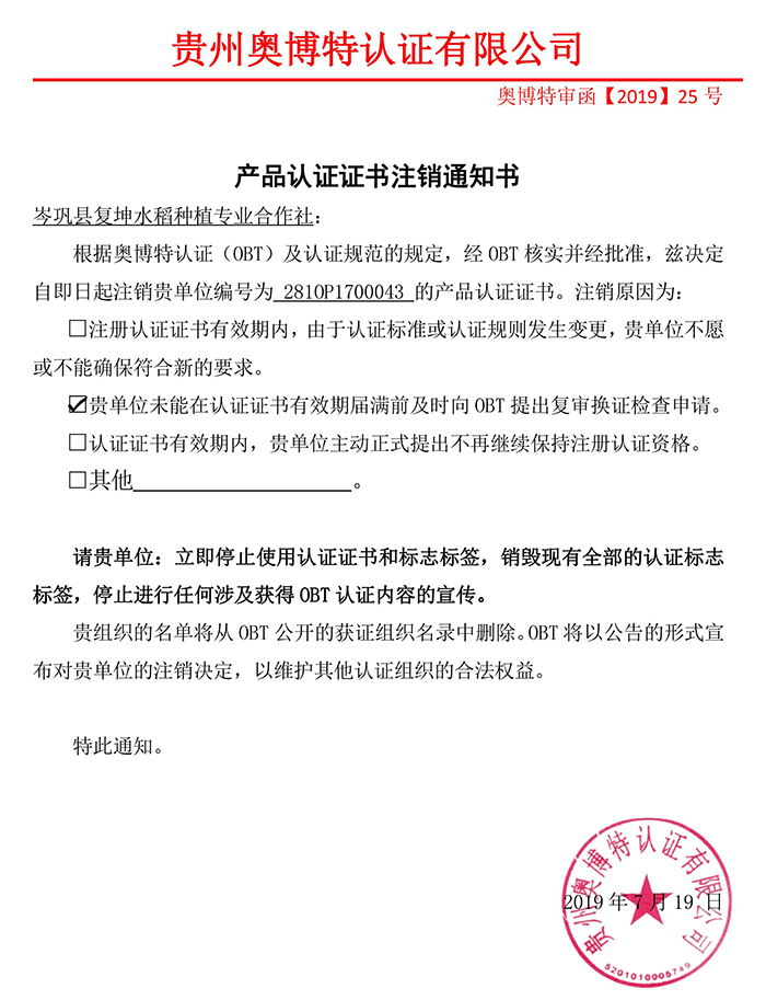 注銷岑鞏縣復(fù)坤水稻種植專業(yè)合作社產(chǎn)品認(rèn)證證書通知