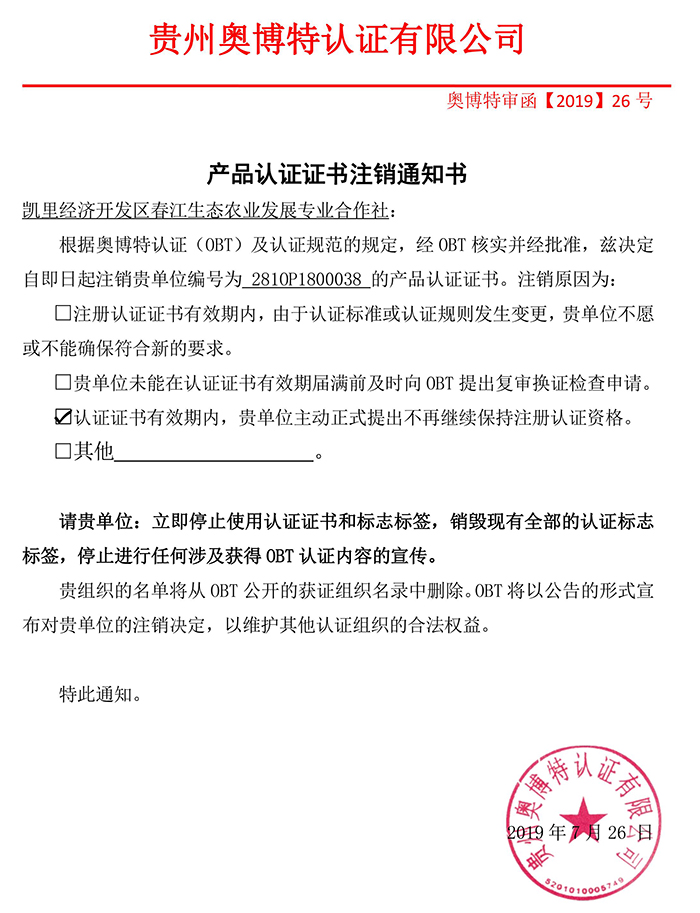 注銷凱里經濟開發區春江生態農業發展專業合作社產品認證證書通知
