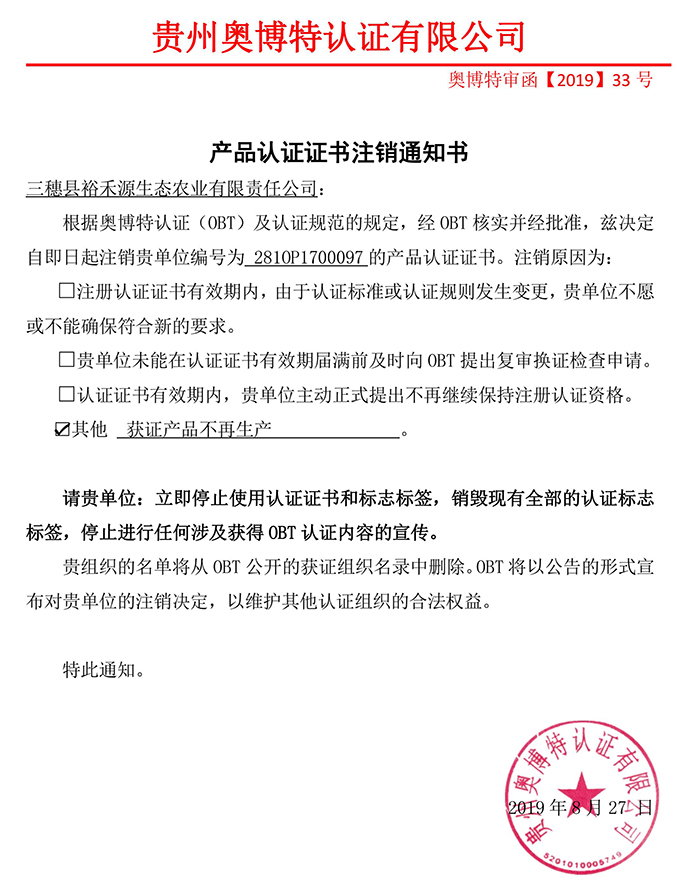 注銷三穗縣裕禾源生態農業有限責任公司產品認證證書通知