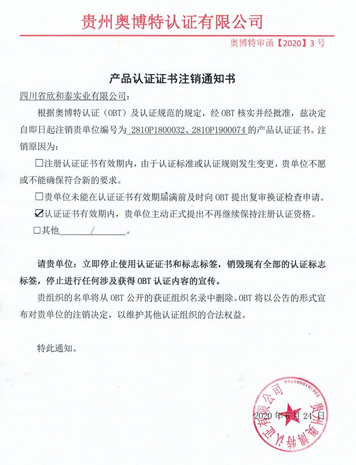 注銷四川省欣和泰實業有限公司產品認證證書通知
