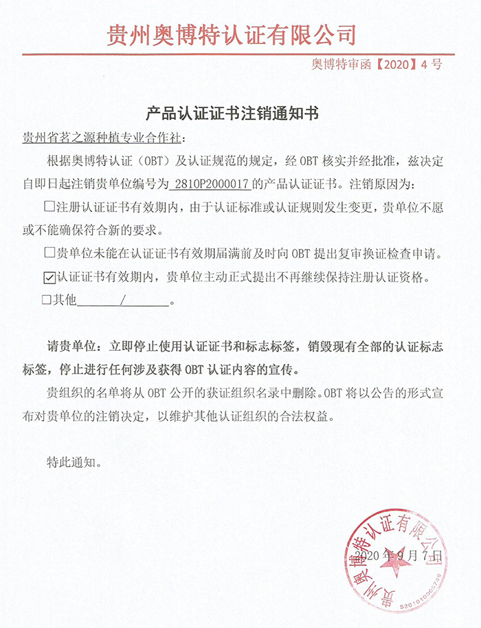 注銷貴州省茗之源種植專業合作社產品認證證書通知