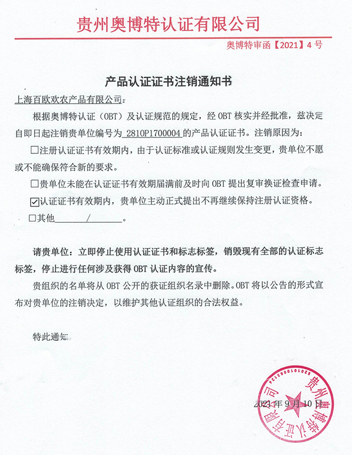注銷上海百歐歡農產品有限公司產品認證證書通知