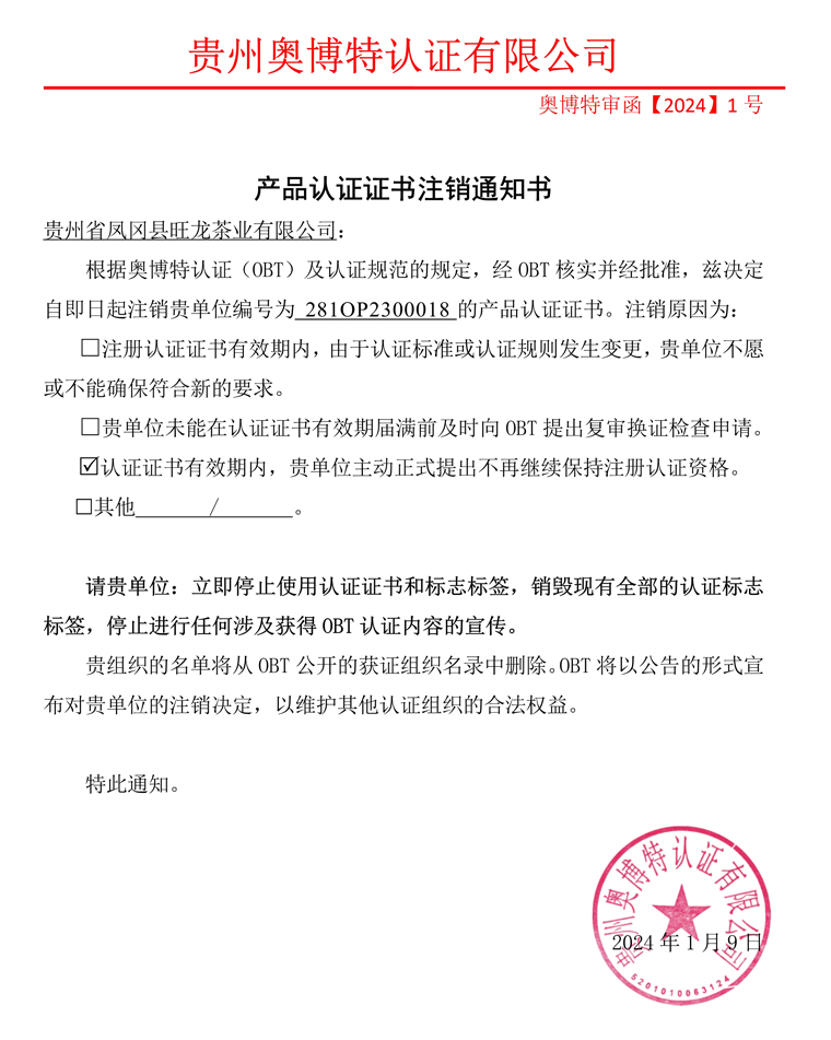 注銷貴州省鳳岡縣旺龍茶業有限公司產品認證證書通知