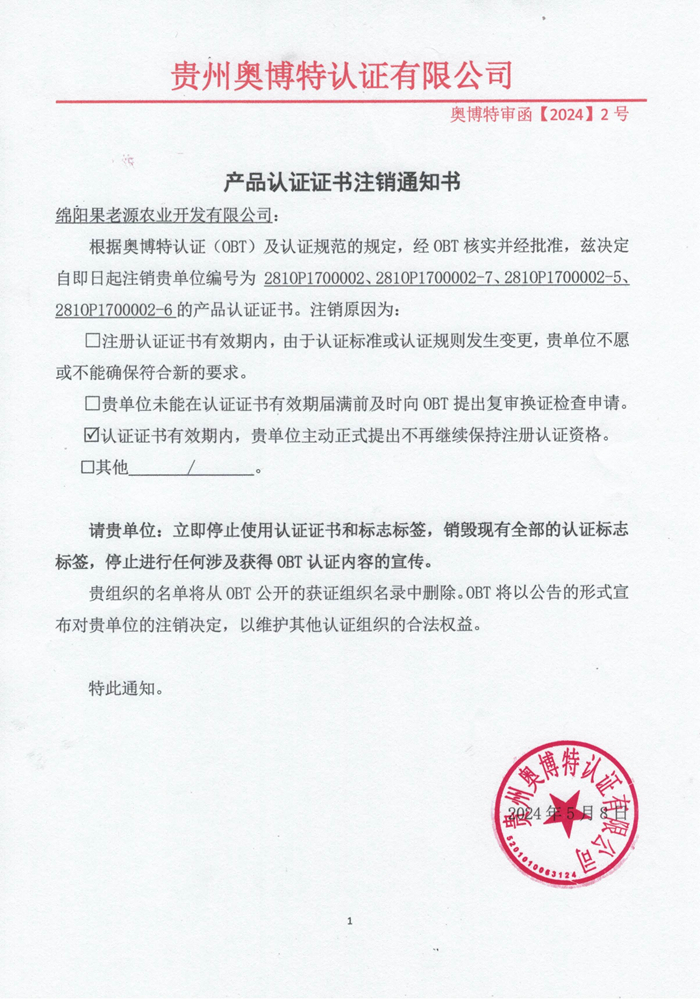 注銷綿陽果老源農業開發有限公司產品認證證書通知