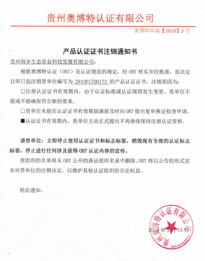 注銷貴州侗鄉生態農業科技發展有限公司產品認證證書通知