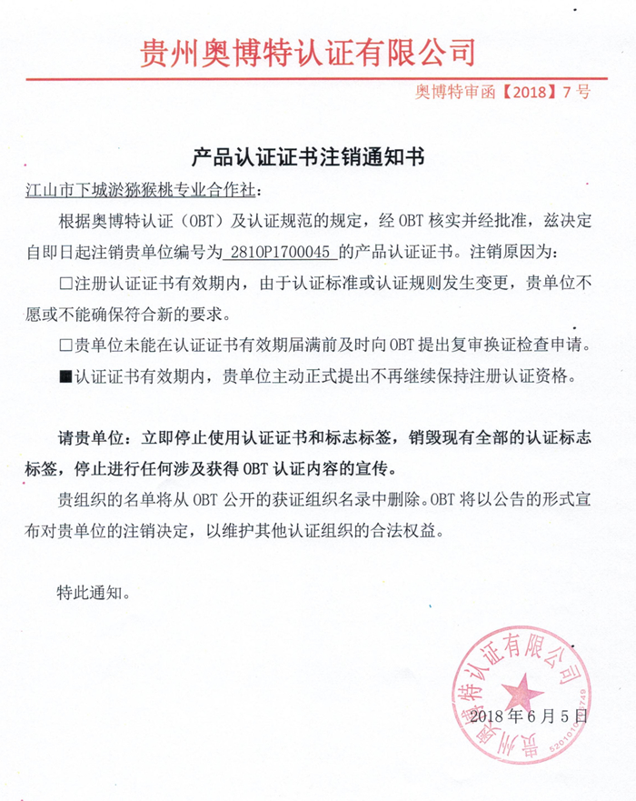 注銷江山市下城淤獼猴桃專業合作社產品認證證書通知