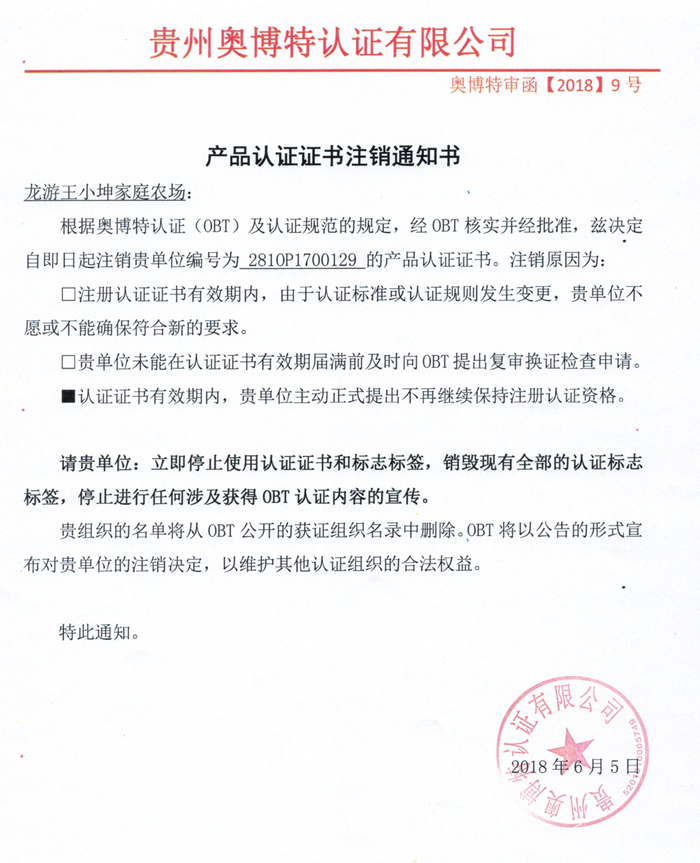 注銷龍游王小坤家庭農(nóng)場產(chǎn)品認(rèn)證證書通知