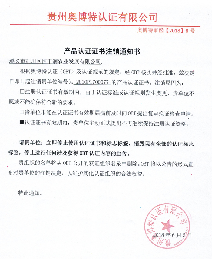 注銷遵義市匯川區恒豐潤農業發展有限公司產品認證證書通知