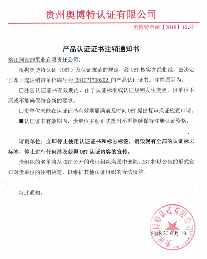 注銷榕江侗家韻果業(yè)有限責(zé)任公司產(chǎn)品認(rèn)證證書通知